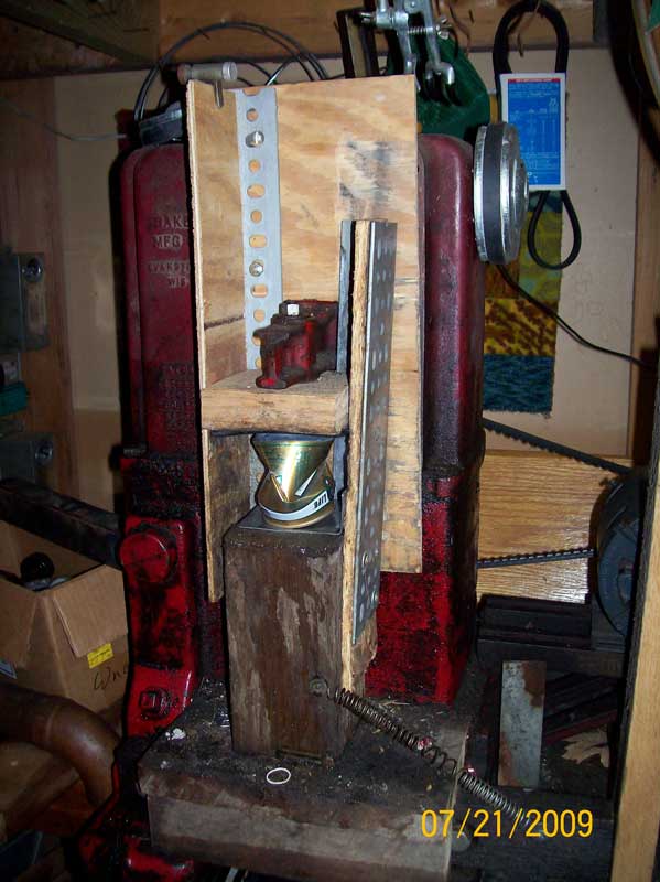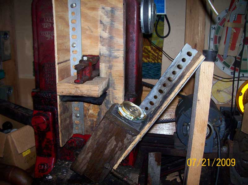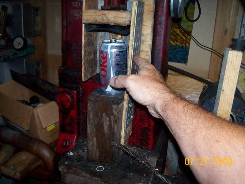 Recycling Aluminum Cans.Our neighbornood organization ( Sheridan Triangle Neighborhood Association ) is financed primarily with the procedes from recycling aluminum cans. Residents in the neighborhood drop off cans that they save (and collect) and I crush them with my can crusher. When I have load I take them to the recycle center . Every few months I take a load of between 50 and 100 pounds. For a while last year (2008) this brought a nice check. Now it's just a few dollars. Can crusher made from old pump jack. I've been using this machine for over 30 years to crush aluminum cans for recycling. It was built by Baker Manufacturing (no relation) for use in converting old windmill driven water pumps to 'modern' electricity. I adapted it for can crushing and refined the design over the years for safety and reliability. The crusher goes up and down about once every two seconds. This picture shows a can half crushed. The pedistal that holds the can under the ram automatically swings away when the can is crushed and the ram begins to move back up.